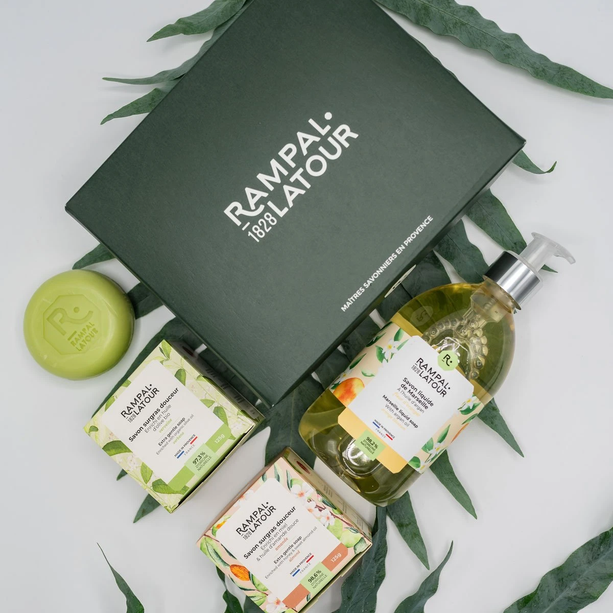 Cele trei produse vin ambalate în cutia cadou Rampal Latour.