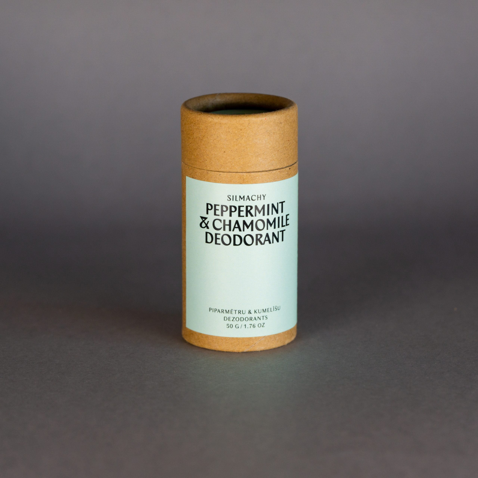 Deodorant natural Peppermint & Chamomile SILMACHY – protecție blândă și eficientă fără aluminiu, în tub home compostable. Ingrediente 100% naturale pentru piele sensibilă.