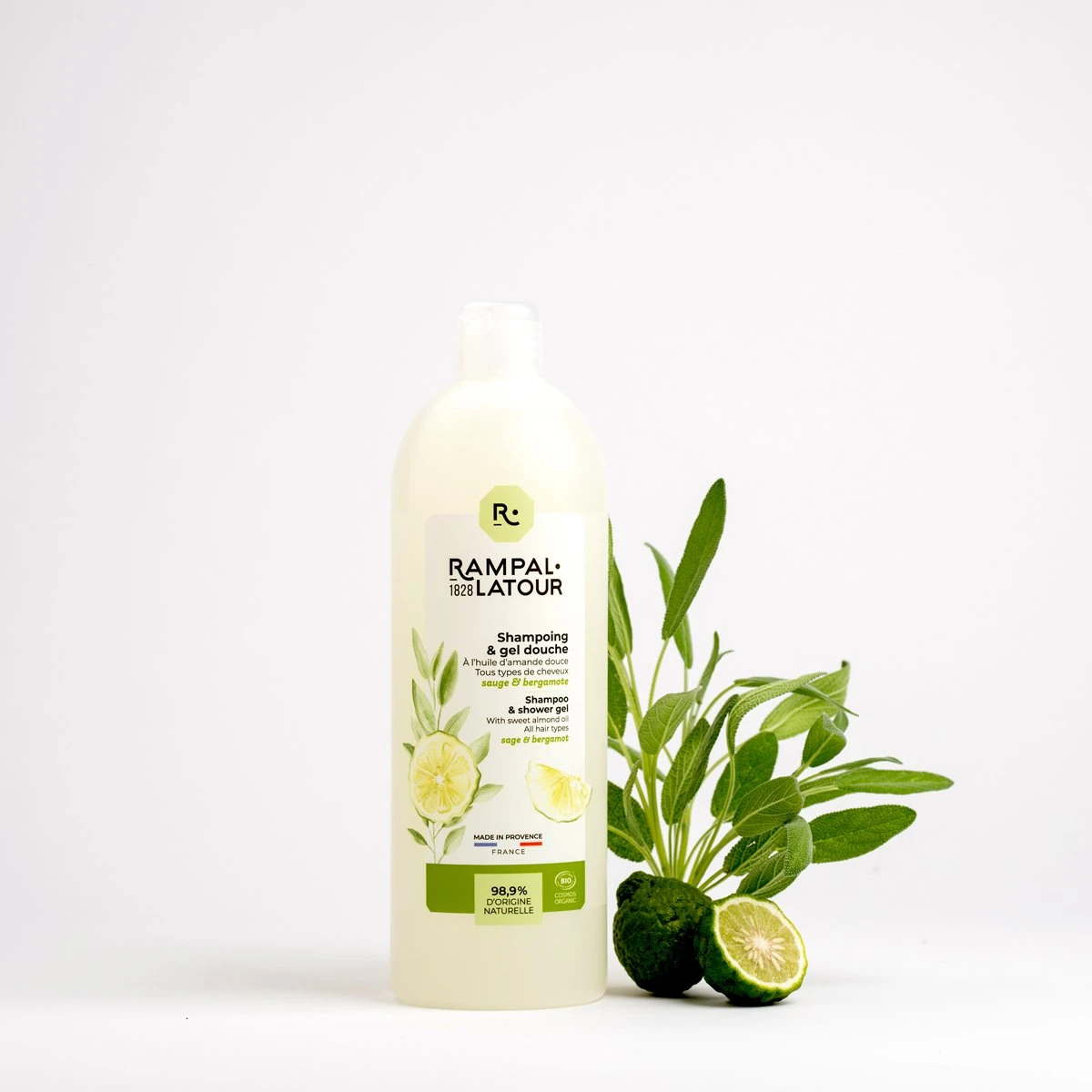 Gel de duş & şampon certificat bio, hidratant şi relaxant, cu salvie şi bergamotă.