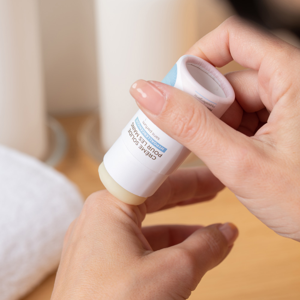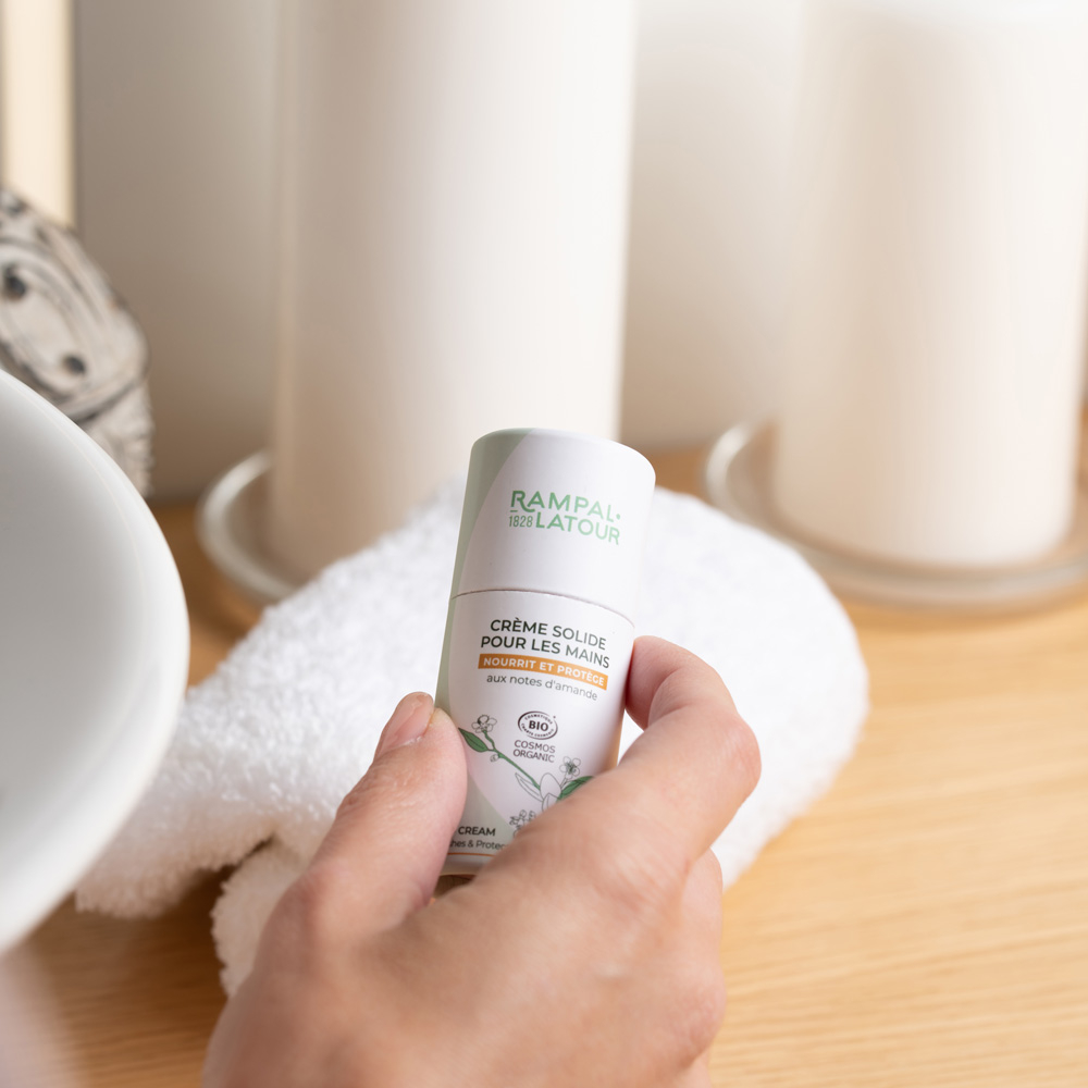 Crema de mâini organică sub formă solidă de stick este ideală pentru îngrijirea de zi cu zi a mâinilor.