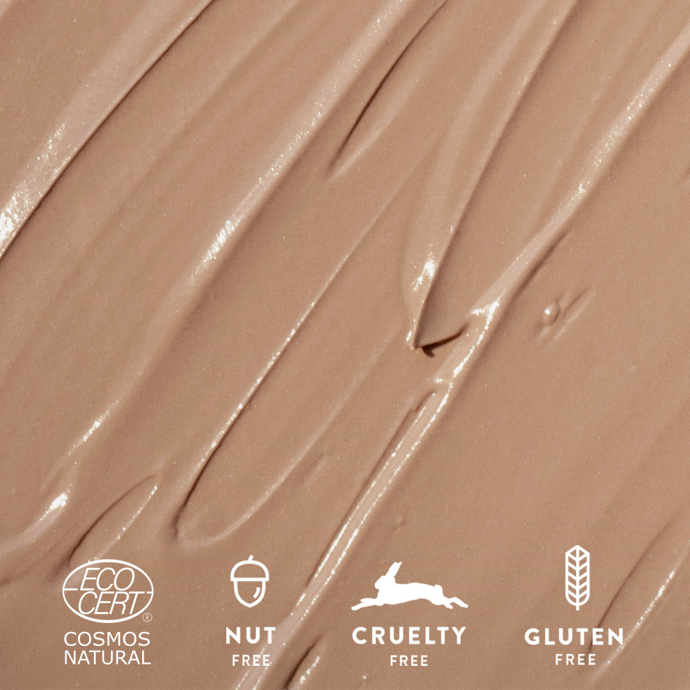 Ingrediente: ALOE BARBADENSIS (ALOE) LEAF JUICE*; DICAPRYLYL CARBONATE; ISOAMYL LAURATE; ZINC OXIDE; GLYCERIN; CERA ALBA (BEESWAX)*; SORBITAN OLIVATE; CI 77891 (TITANIUM DIOXIDE) **; LECITHIN; POLYGLYCERYL-2 DIPOLYHYDROXYSTEARATE; SILICA; AQUA; SODIUM CHLORIDE; CELLULOSE; HIPPOPHAE RHAMNOIDES (SEA BUCKTHORN) FRUIT EXTRACT*; SORBITAN CAPRYLATE; PALMITIC ACID; STEARIC ACID; CI 77491 (IRON OXIDES); CI 77492 (IRON OXIDES); CI 77499 (IRON OXIDES)**; CITRIC ACID; HYPERICUM PERFORATUM (ST. JOHN'S WORT) EXTRACT*; PROPANEDIOL; CAPRYLYL GLYCOL; BENZOIC ACID; ASCORBYL PALMITATE; SODIUM PHYTATE; TOCOPHEROL; CAMELLIA SINENSIS (BLACK TEA) LEAF EXTRACT*; QUERCUS ROBUR (OAK) BARK EXTRACT*; VITIS VINIFERA (GRAPE) SEED EXTRACT*; VANILLIN; SODIUM BENZOATE; HYDROLYZED HYALURONIC ACID; SODIUM HYALURONATE; POTASSIUM SORBATE. *ingrediente din agricultura biologica, **pigmenti minerali puri