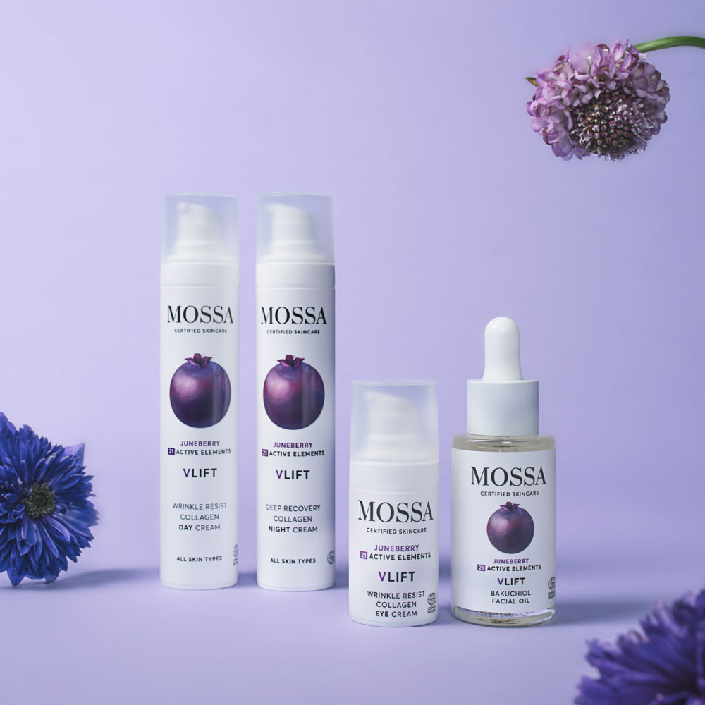 Fiecare produs MOSSA conține extracte dintr-un fruct de pădure anume provenind din țările nordice. Aceste fructe au proprietăți remarcabile – au un puternic efect antioxidant, sunt extrem de bogate în vitamine și ingrediente active pe care pielea le recunoaște și le înțelege. Toate produsele sunt testate dermatologic și sunt certificate bio conform standardului internațional ECOCERT. Acestea nu conțin substanțe artificiale care dăunează corpului. De asemenea, caracterul skin-friendly al cosmeticelor MOSSA face ca ingredientele lor să se poată armoniza în mod firesc cu nevoile pielii, pentru cele mai bune rezultate.