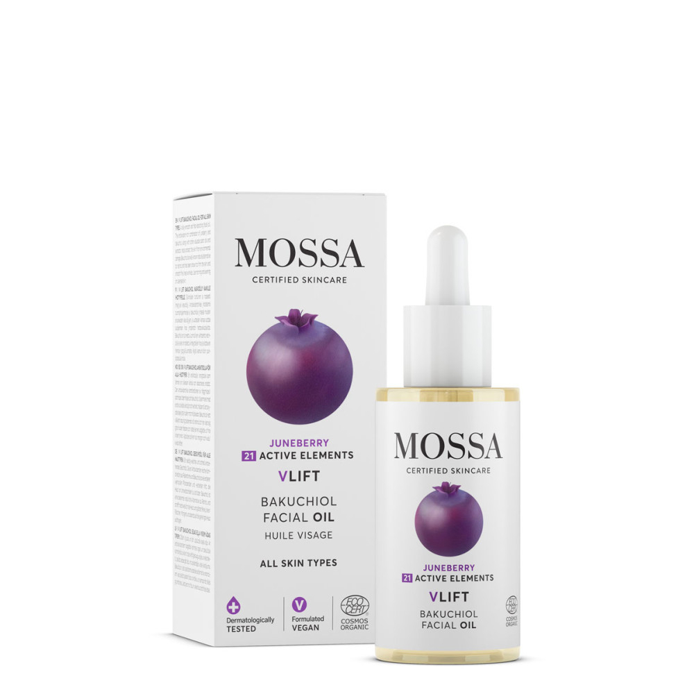 Formula inovatoare a uleiului facial de la Mossa combină efectul delicat, similar retinolului, al bakuchiolului cu compoziția bogată în antioxidanți a extractului din fructul nordic merișor de miere (fruct asemănător cu afinele). Se adaugă uleiuri de luminița nopții și măceșe, iar împreună, toate aceste ingrediente ajută la menținerea supleții pielii și o protejează de factorii nocivi din mediu.